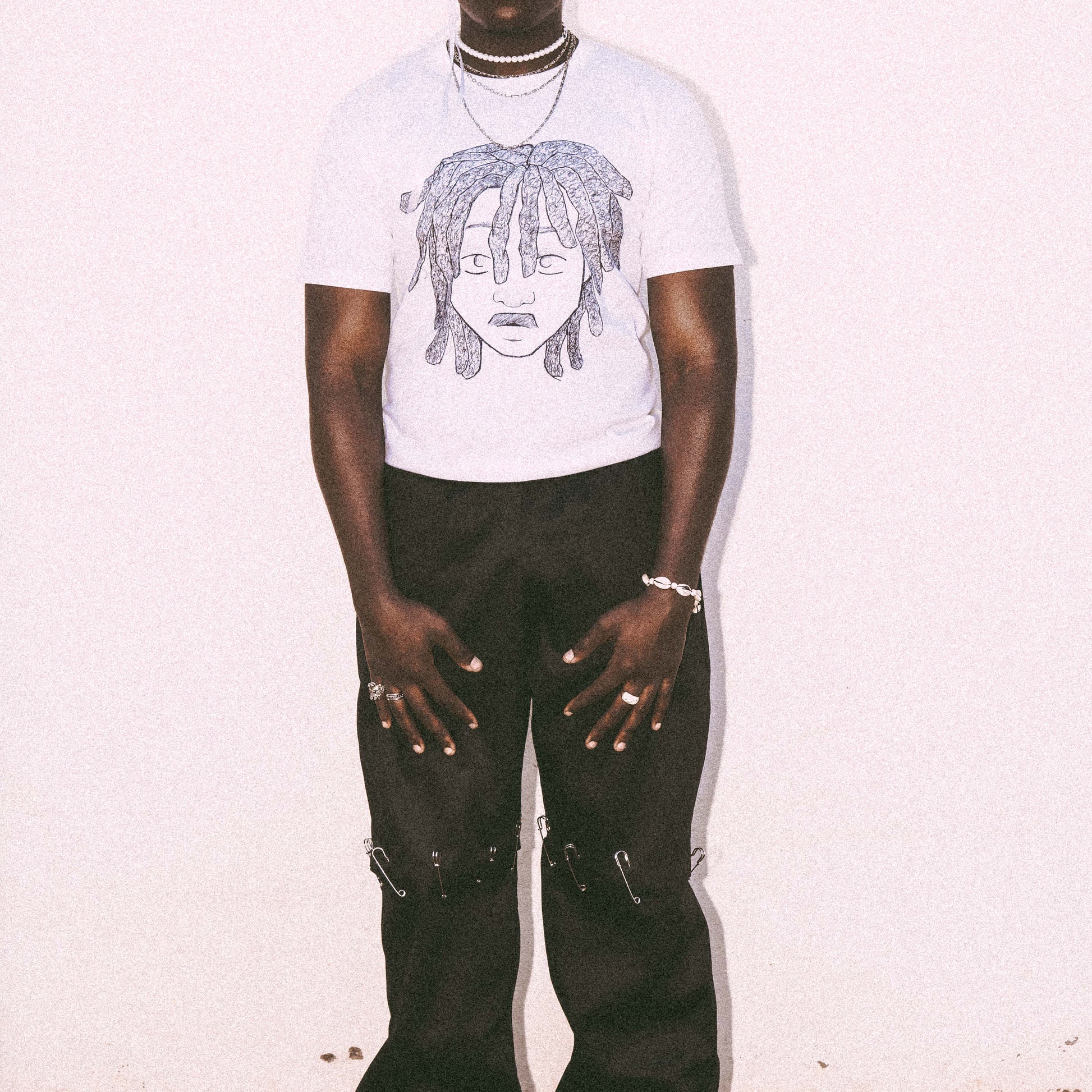 Edgy, deconstructed black pants designed with a split construction joined together using safety pins. The detachable sections allow the piece to be worn as full-length pants or styled as shorts, offering versatility and a rebellious, street-inspired aesthetic.